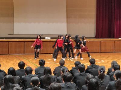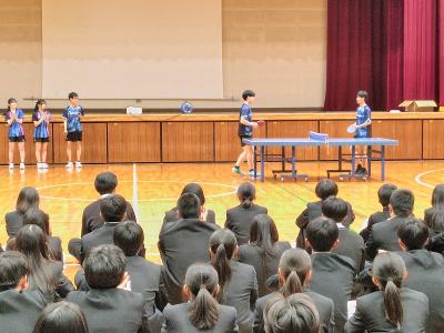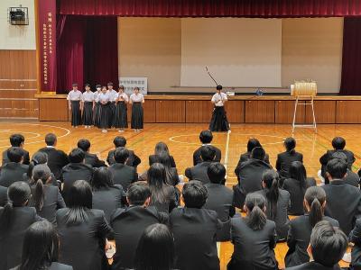 令和8年4月8日(水)、4・5時限目に本校第一体育館において部活動紹介が行われました。「文武不岐」の校風のもと、部活動が非常に盛んな本校では、それぞれの部活動の代表が特色や魅力を工夫を凝らして紹介し、新入生に向けて熱意あふれるアピールを行いました。実演やポスター、ユーモアを交えた発表なども見られ、会場は終始活気に満ちた雰囲気に包まれていました。