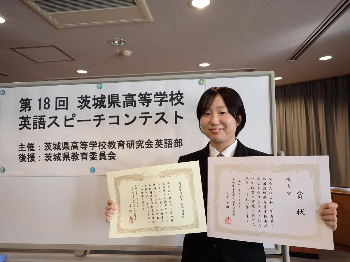 水戸市国際交流センターにて行われた「第18回茨城県高等学校英語スピーチコンテスト」にて、2年木村日菜子さんが優秀賞を受賞し、関東大会出場が決まりました!