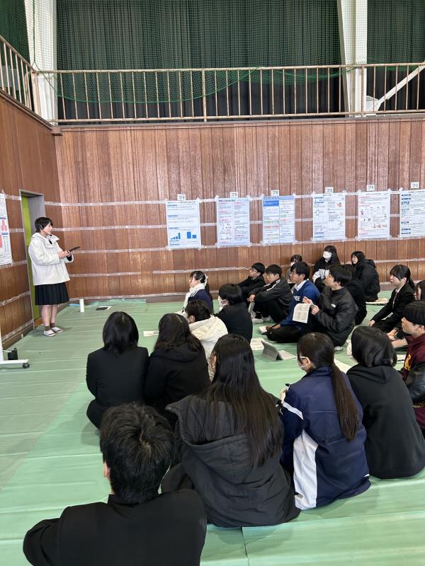 発表が始まると、生徒たちは自分たちの研究内容をポスターを指し示しながら説明します。来場者から「なぜこのテーマにしたのですか」「調査はどのように行いましたか」といった質問が投げかけられると、生徒たちはこれまでの調査や分析の結果をもとに、自分の言葉で丁寧に答えていました。