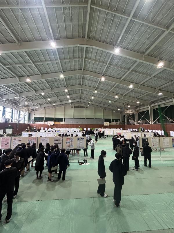 会場には生徒が作成したポスターが並び、来場者が各ブースを巡りながら発表を聞くポスターセッション形式です。