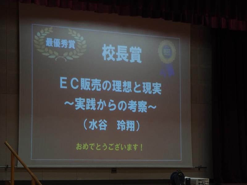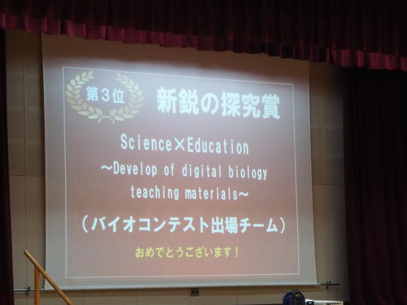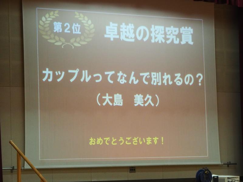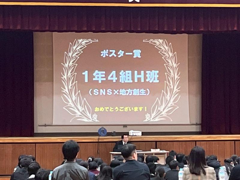 上位発表の前に、ポスターのデザインが印象的だったチームも表彰されました。1年4組H班の皆さん、おめでとうございます。