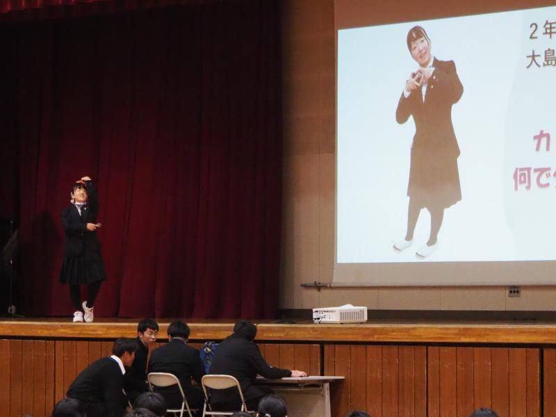 SNS時代の発信をテーマに、生徒たちが企画・撮影・編集まで行ったオリジナルCMを上映。ユーモアあふれる演出や印象的なキャッチコピーなど、それぞれのチームの個性が光る作品に、会場からは笑いや拍手が起こりました。