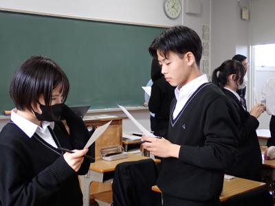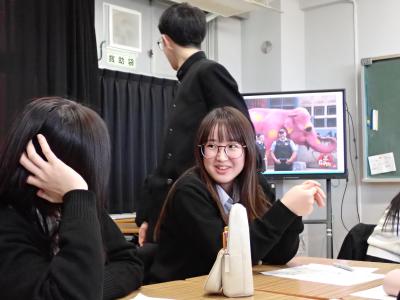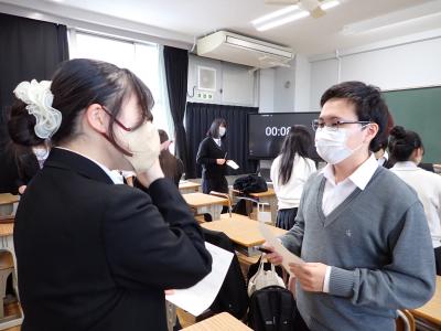 今日は校内企画の事前英語研修です。本校のALTの先生方が特別授業を企画してくださいました。まずはをウォームアップとして、しっかりと握手を交わして挨拶し合う練習から始めました。そのあと、分からないことの尋ね方、対話を続けるこつなど、現地で必要なことを教えていただきました。オーストラリアのスラングなどもクイズ形式で学び、楽しい時間となりました。